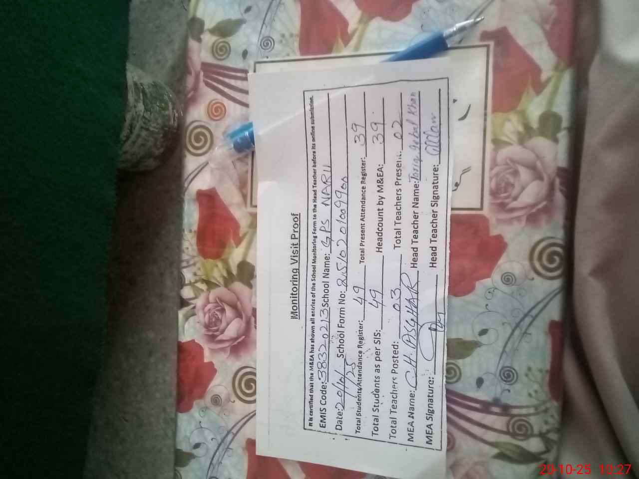 | Attendance Register | Head Teacher | MEA with School | Visit Proof |