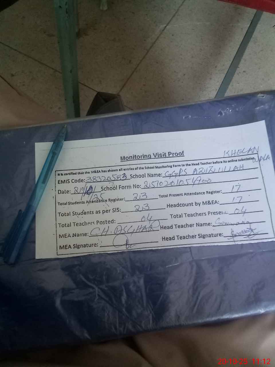 | Attendance Register | Head Teacher | MEA with School | Visit Proof |