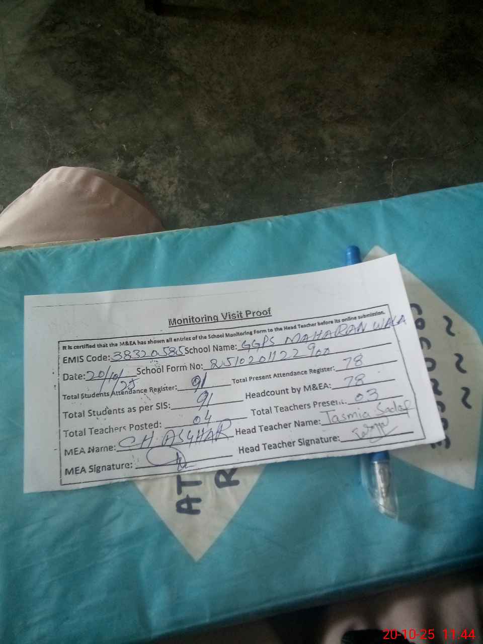 | Attendance Register | Head Teacher | MEA with School | Visit Proof |