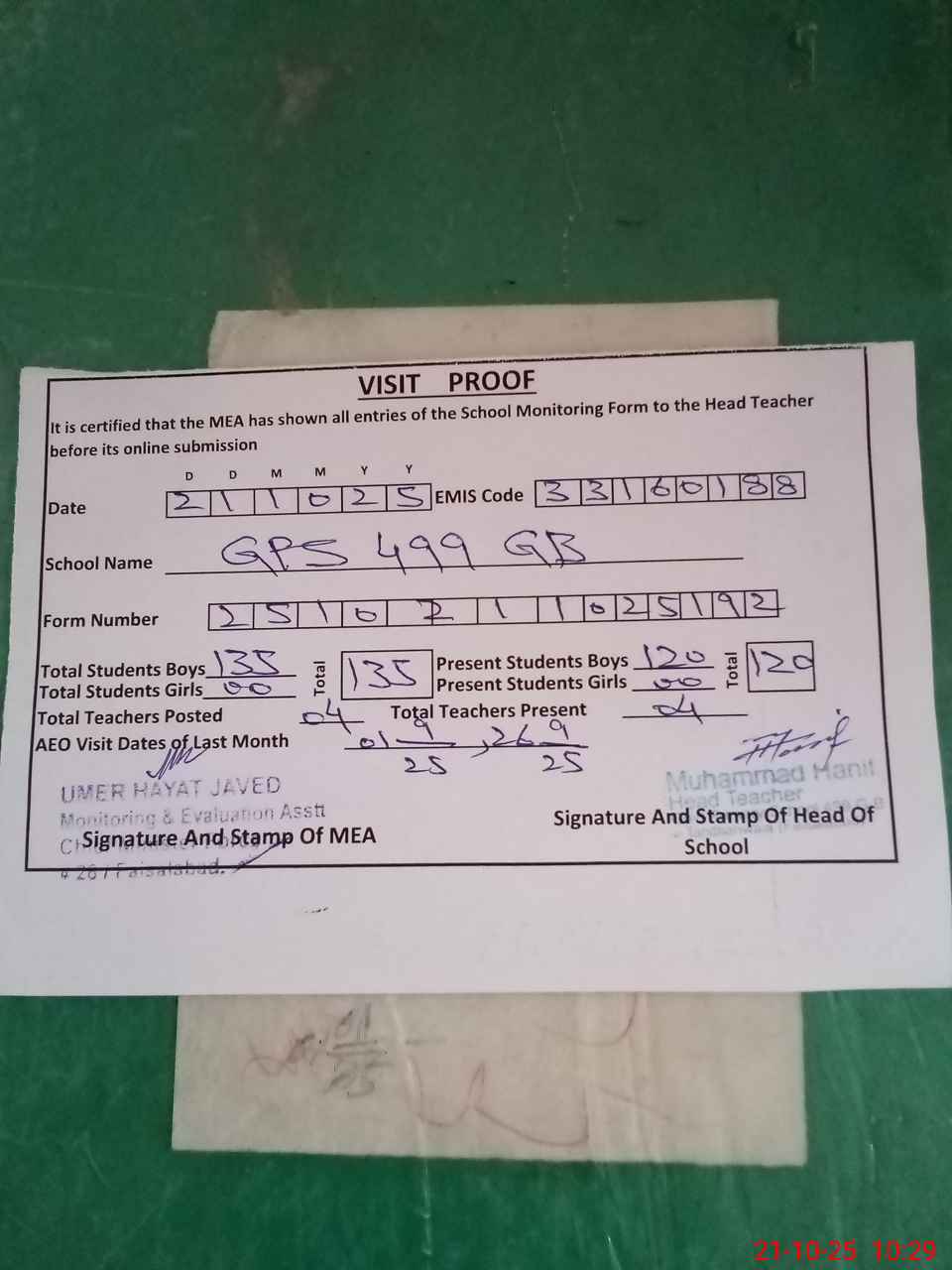 | EMIS Code: 33160188 | Name of School: GPS CHAK 499 GB TANDLIANWALA | |||