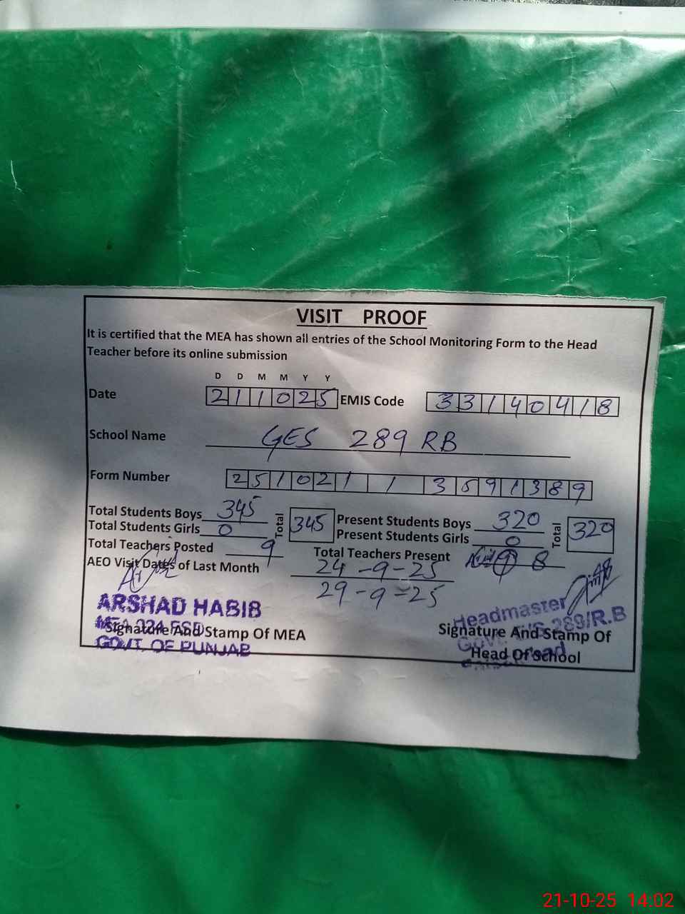 | Attendance Register | Head Teacher | MEA with School | Visit Proof |