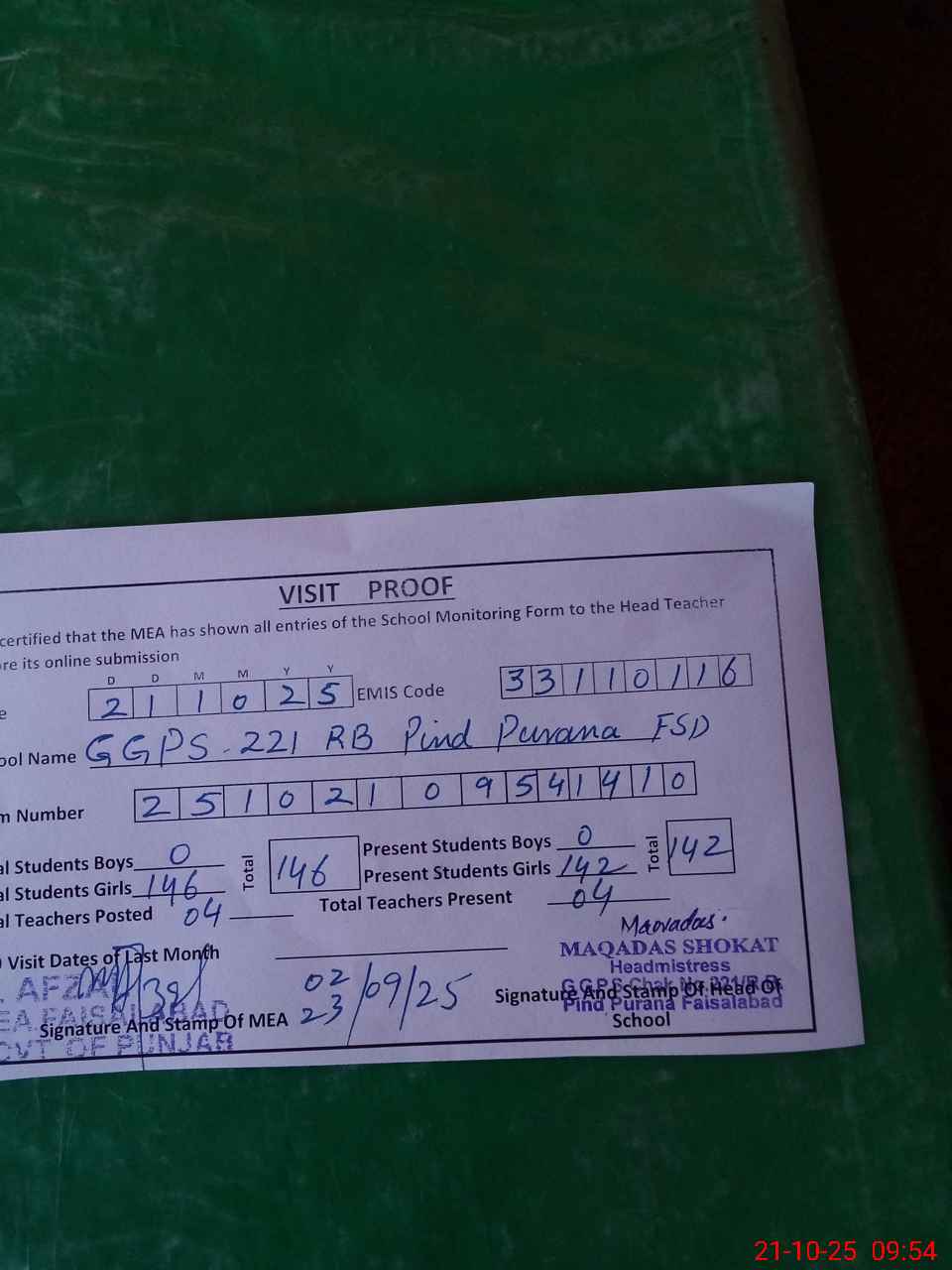 | Attendance Register | Head Teacher | MEA with School | Visit Proof |