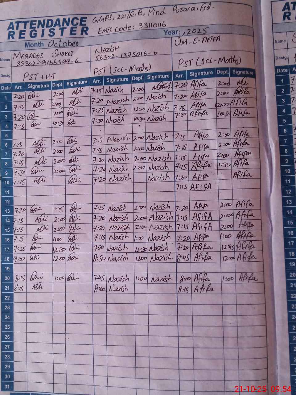 | CNIC | Full Name | Designation | R/C | Absence during last cal. month |