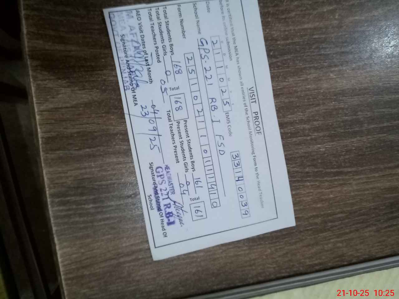 | Attendance Register | Head Teacher | MEA with School | Visit Proof |