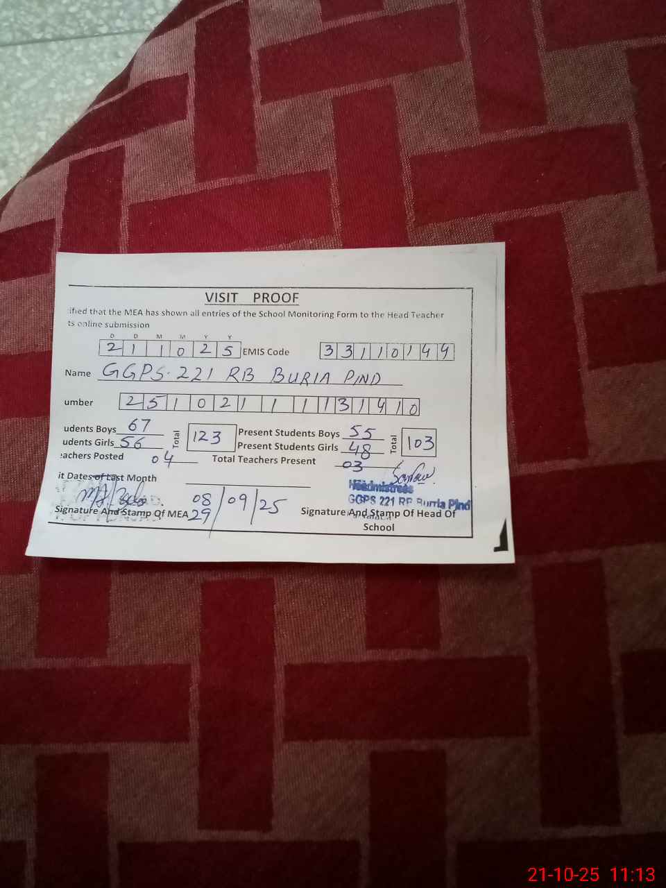 | Attendance Register | Head Teacher | MEA with School | Visit Proof |