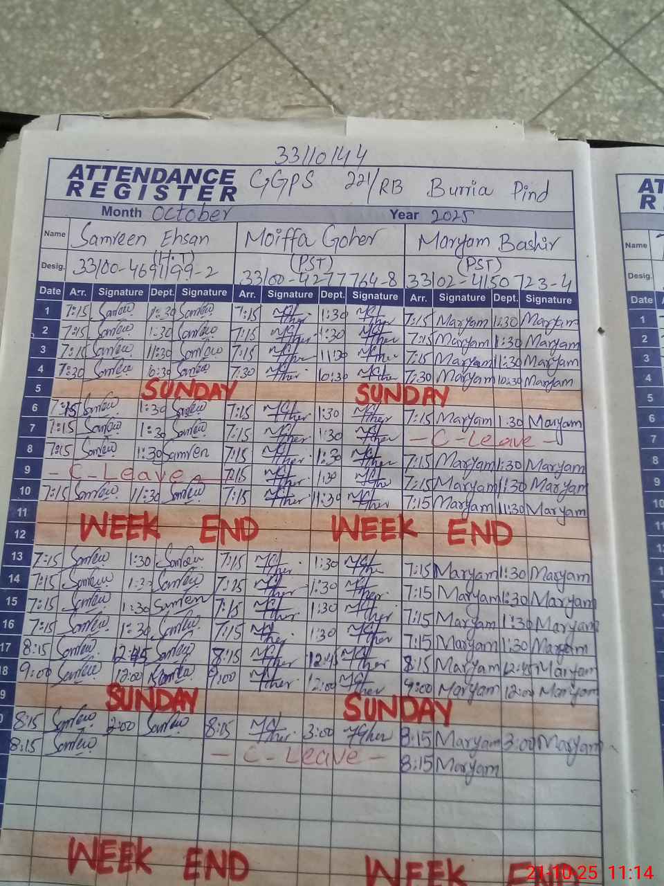 | CNIC | Full Name | Designation | R/C | Absence During Last Calender Month |