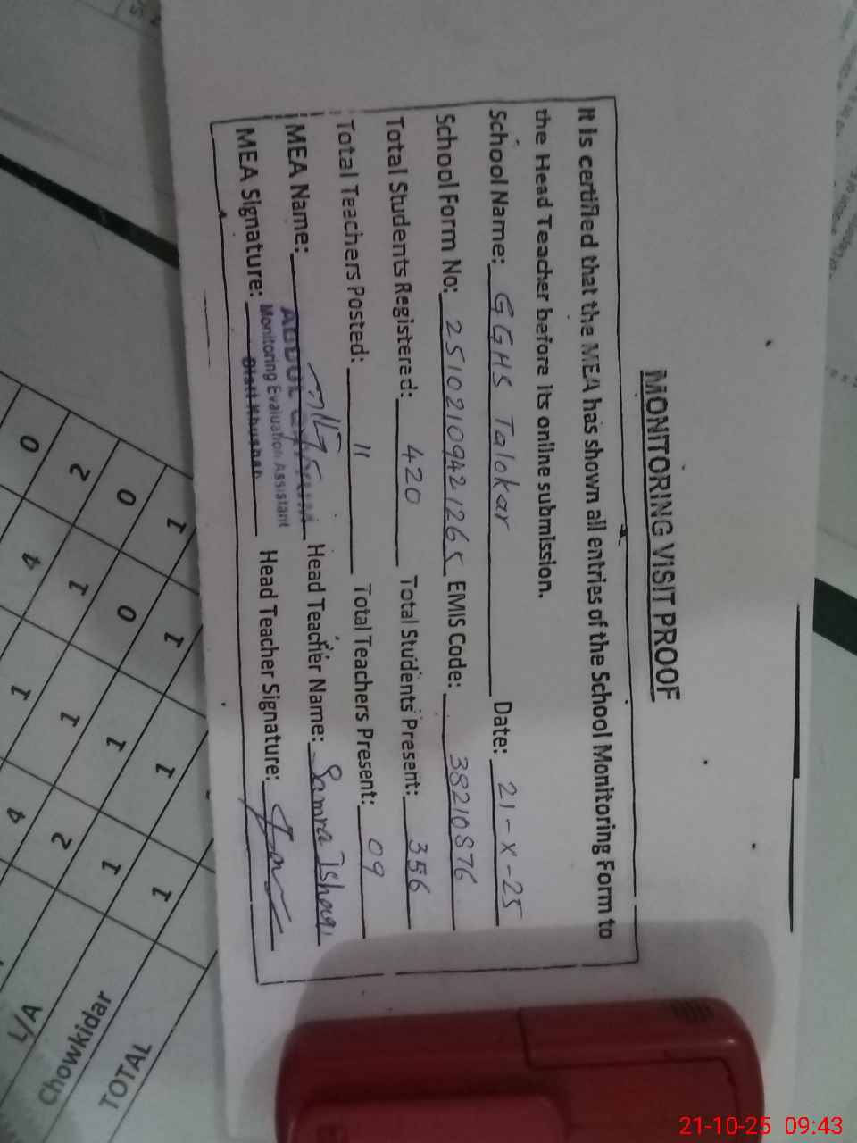 | Attendance Register | Head Teacher | MEA with School | Visit Proof |