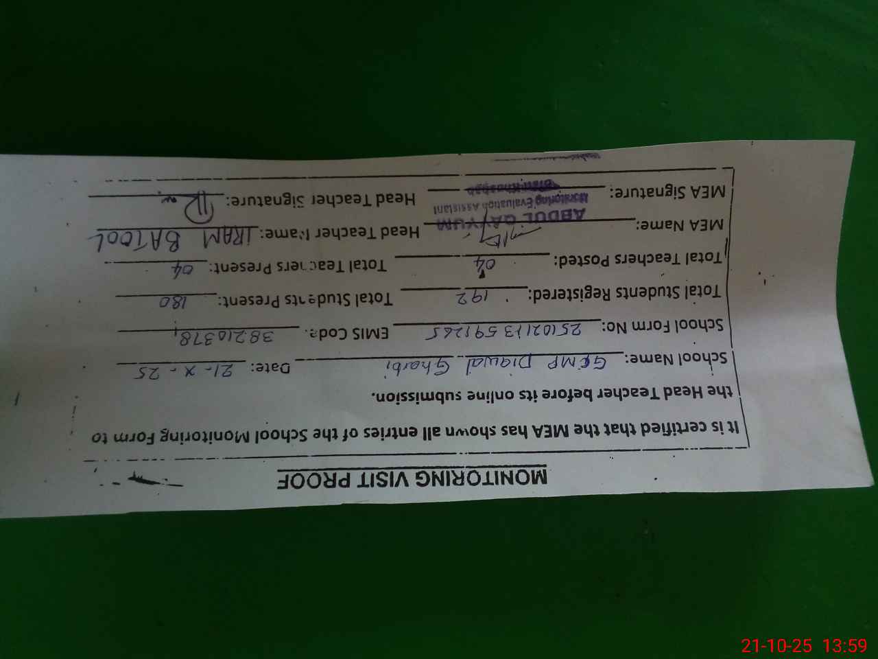 | Attendance Register | Head Teacher | MEA with School | Visit Proof |