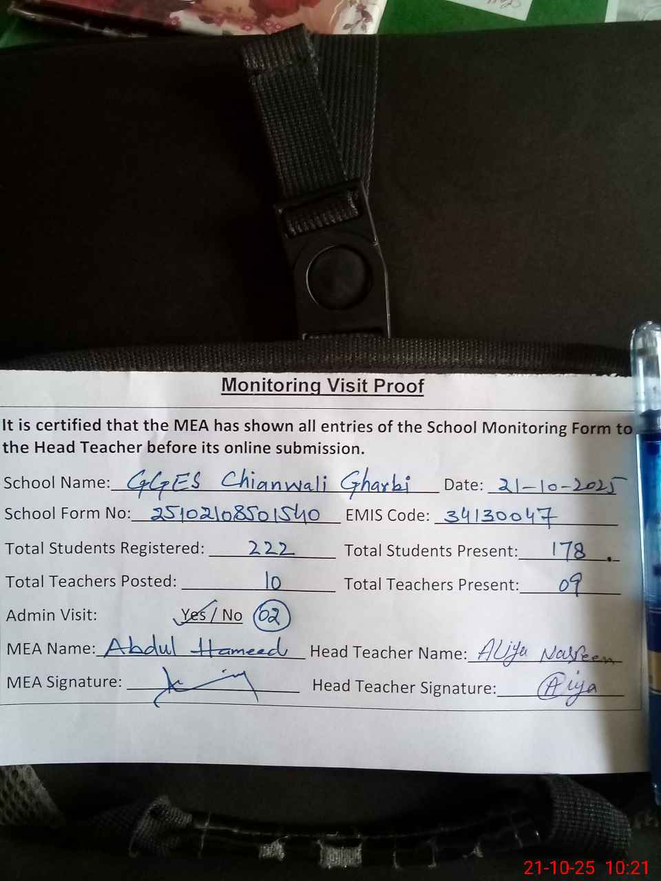 | Attendance Register | Head Teacher | MEA with School | Visit Proof |