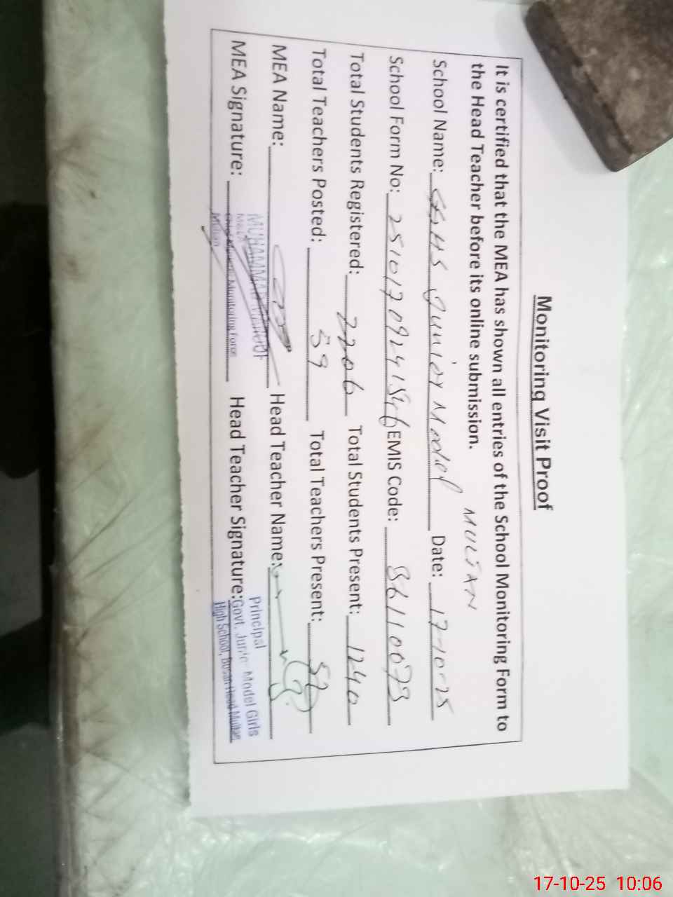 | Certified that this School was Inspected by the Undersigned MEA/DMO Today and the Information Stated Above is as Per Record. | |||||