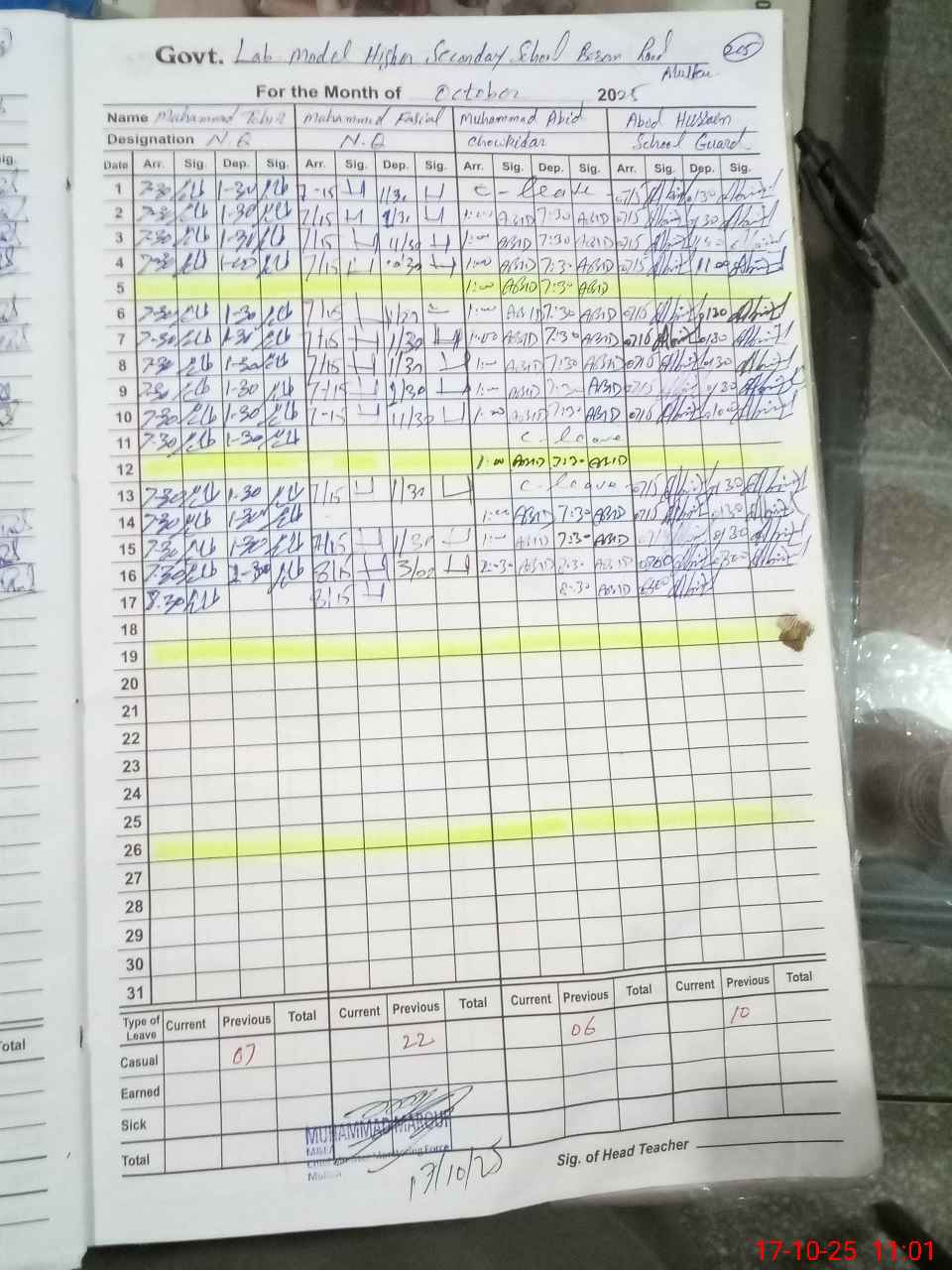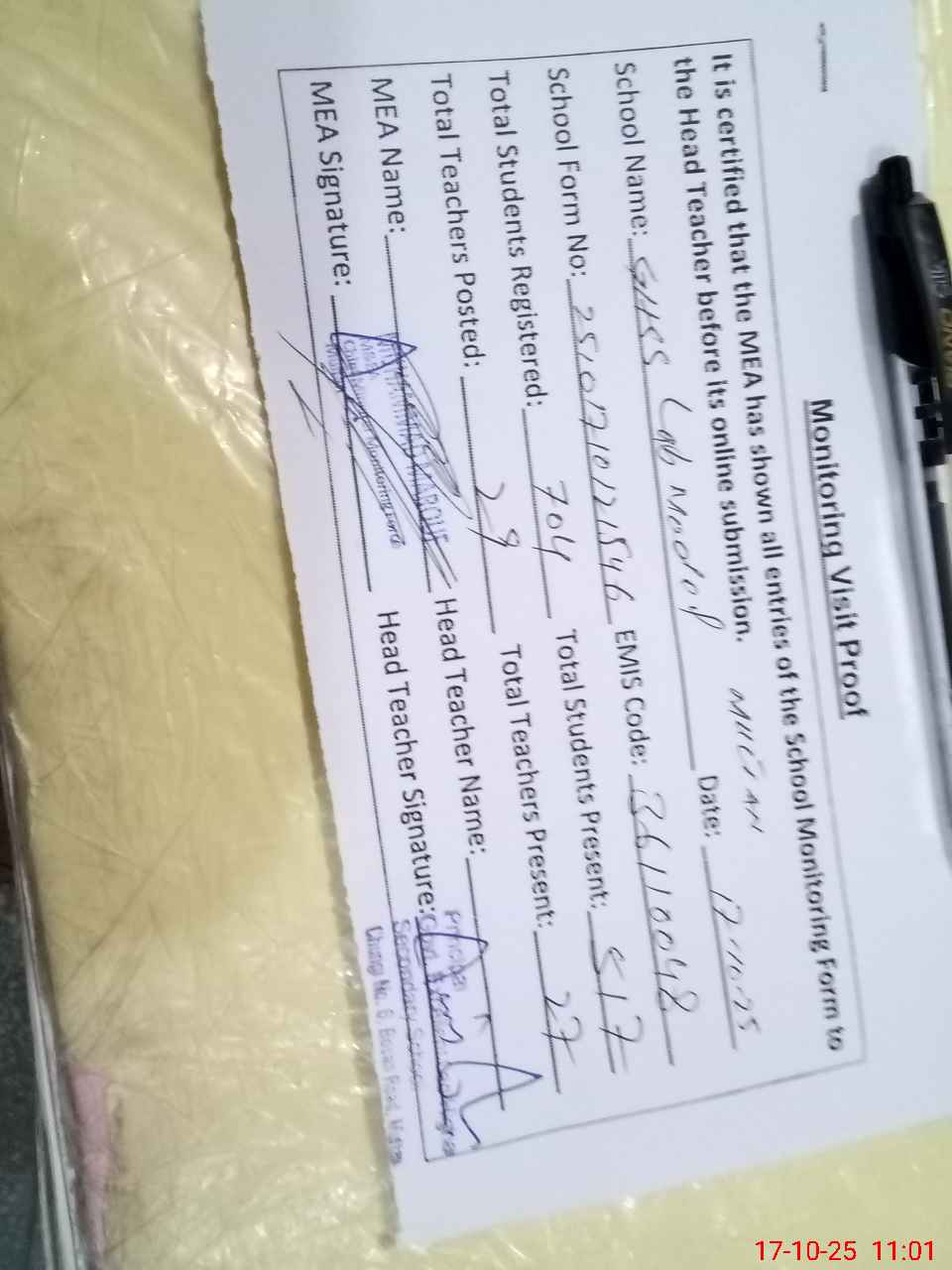 | Remarks (Use Separate Page if Required): Rosnamcha not maintained properly from 11th October 25 Higher secondary portion need structure as 06 class rooms 01lab and 01 library | |||||