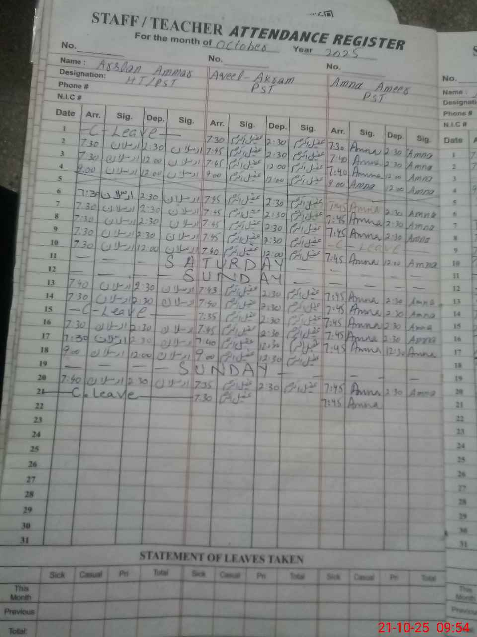 | Name: AR**** AM**** Designation: (School Headmaster's/Headmistress's) PST Phone/Cell Number: 03**** |