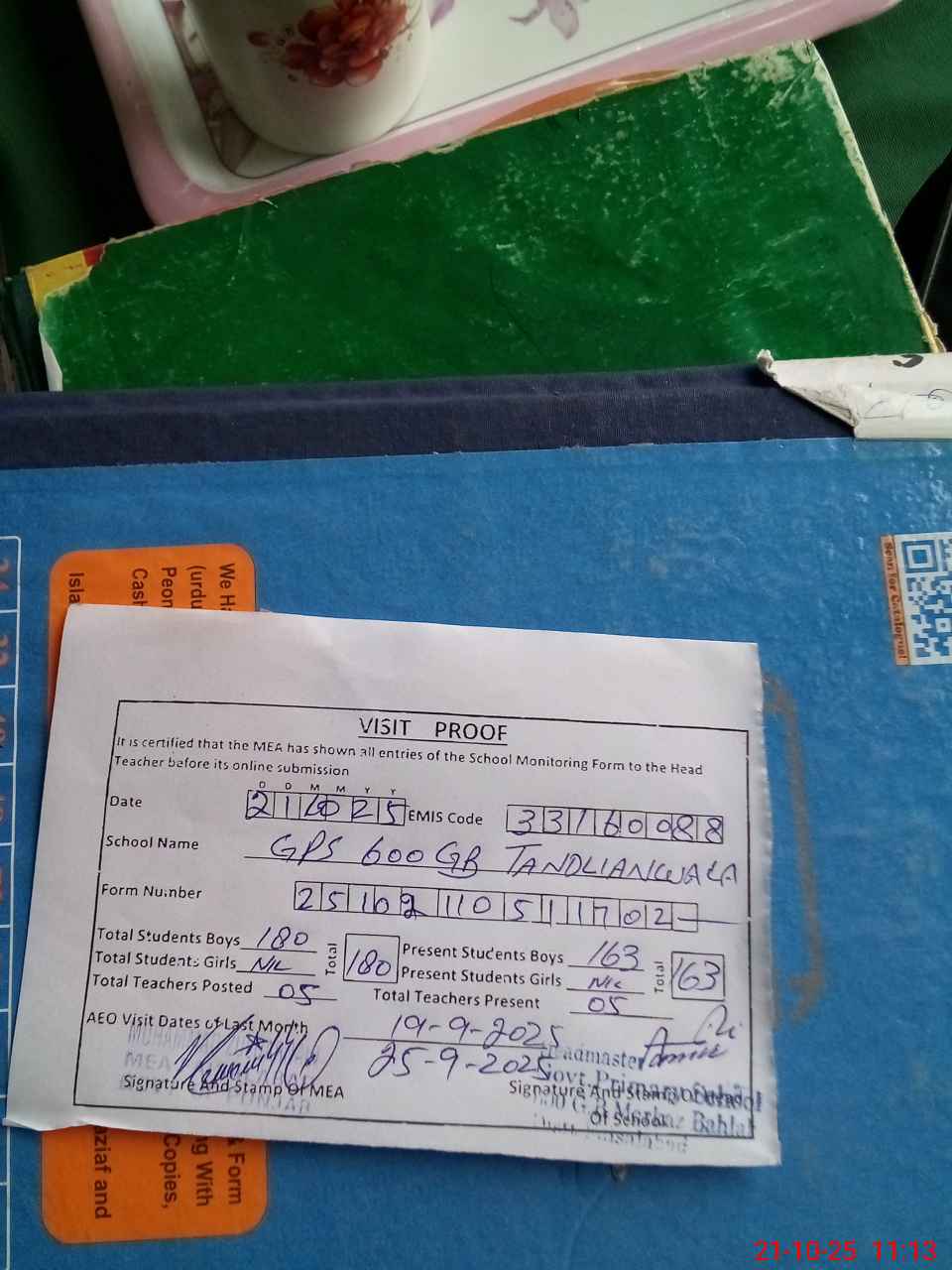 | Attendance Register | Head Teacher | MEA with School | Visit Proof |