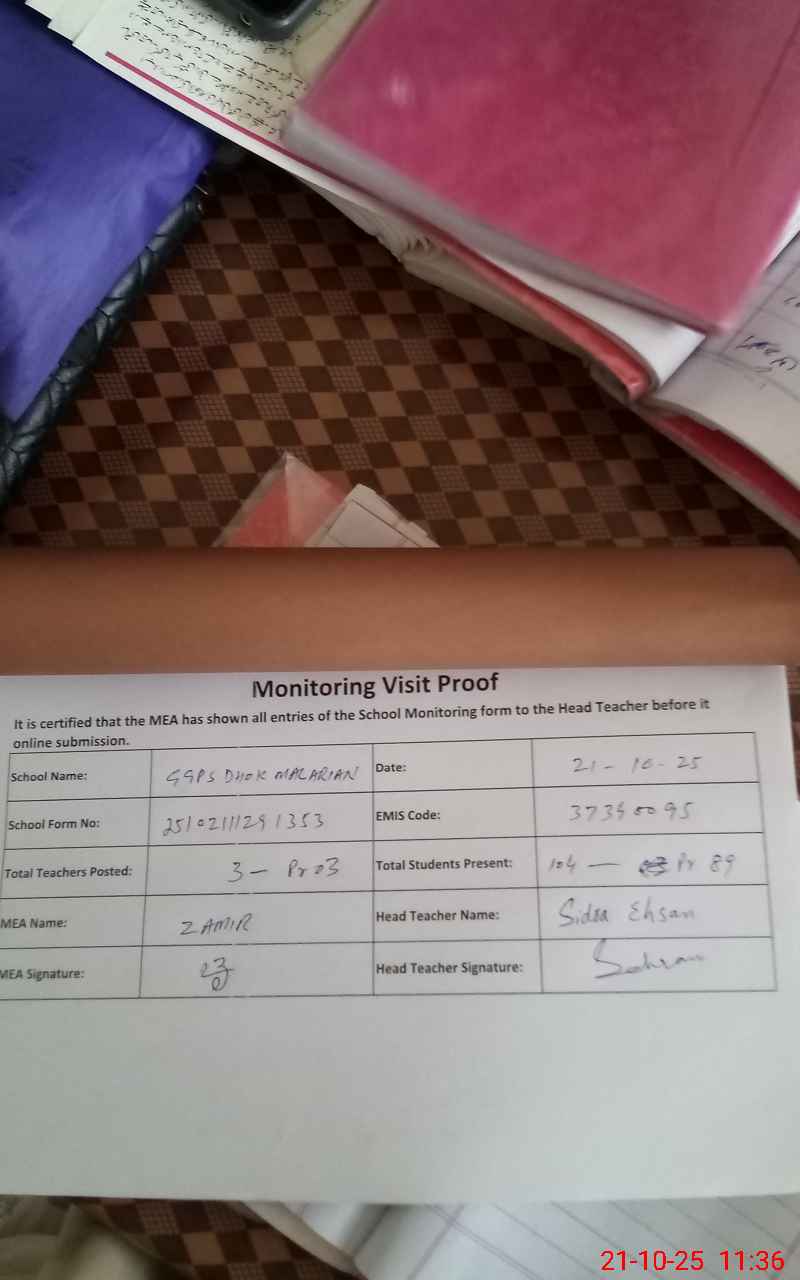 | Attendance Register | Head Teacher | MEA with School | Visit Proof |