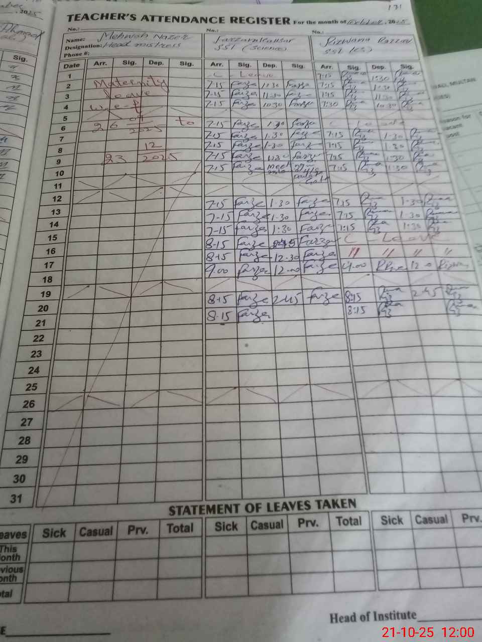 | 36**** | Me**** Na**** | HEADMASTER | Regular | 0 | 0 | 0 | 0 | 0 | 0 | 0 | 0 | 0 | Maternity |