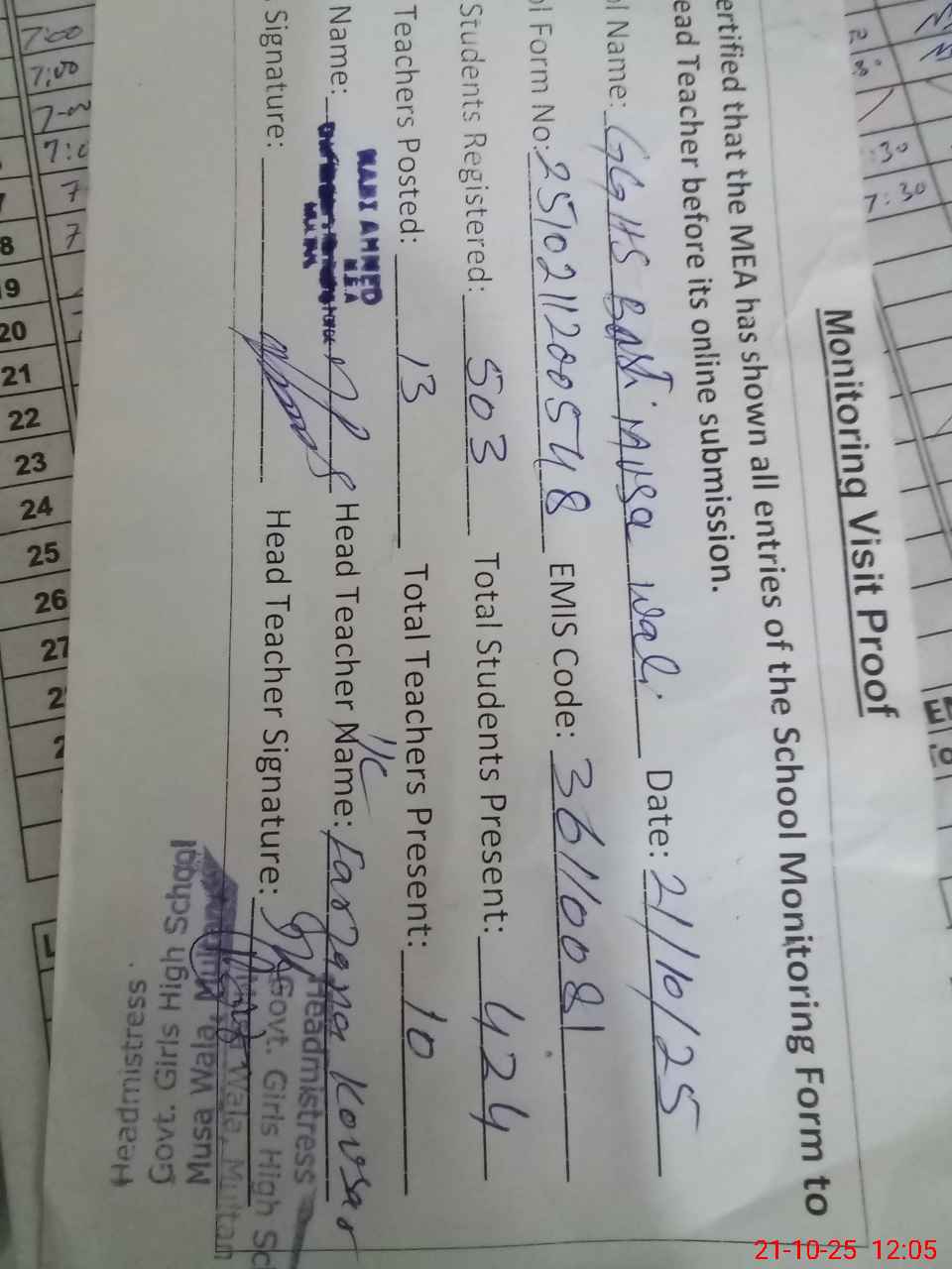 | EMIS Code: 36110081 | Name of School: GGHS BASTI MUSA WALI MULTAN | |||
