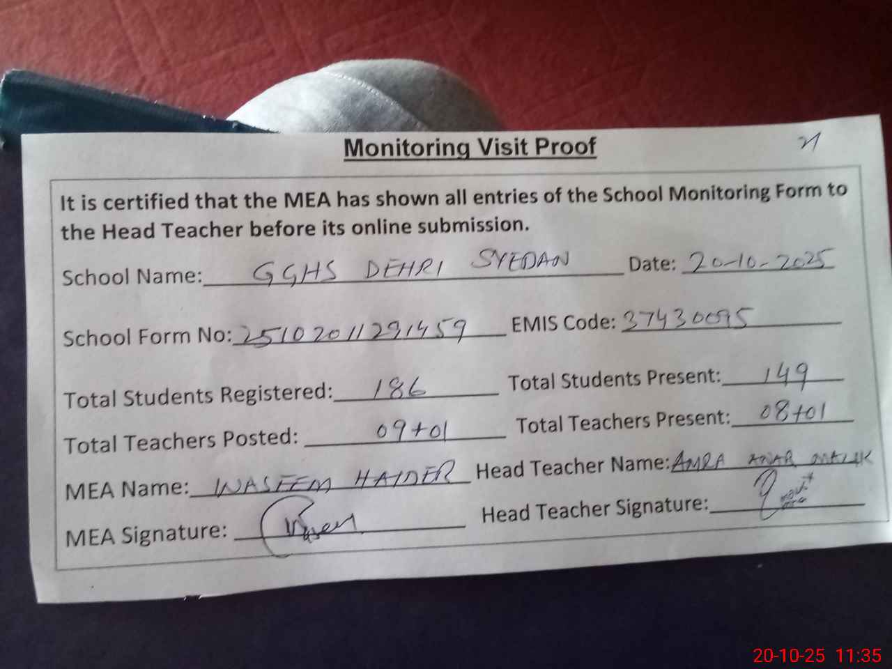 | EMIS Code: 37430095 | Name of School: GGHS DEHRI SYEDAN | |||