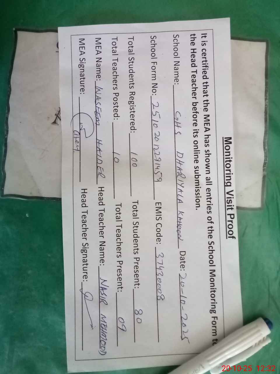 | Attendance Register | Head Teacher | MEA with School | Visit Proof |