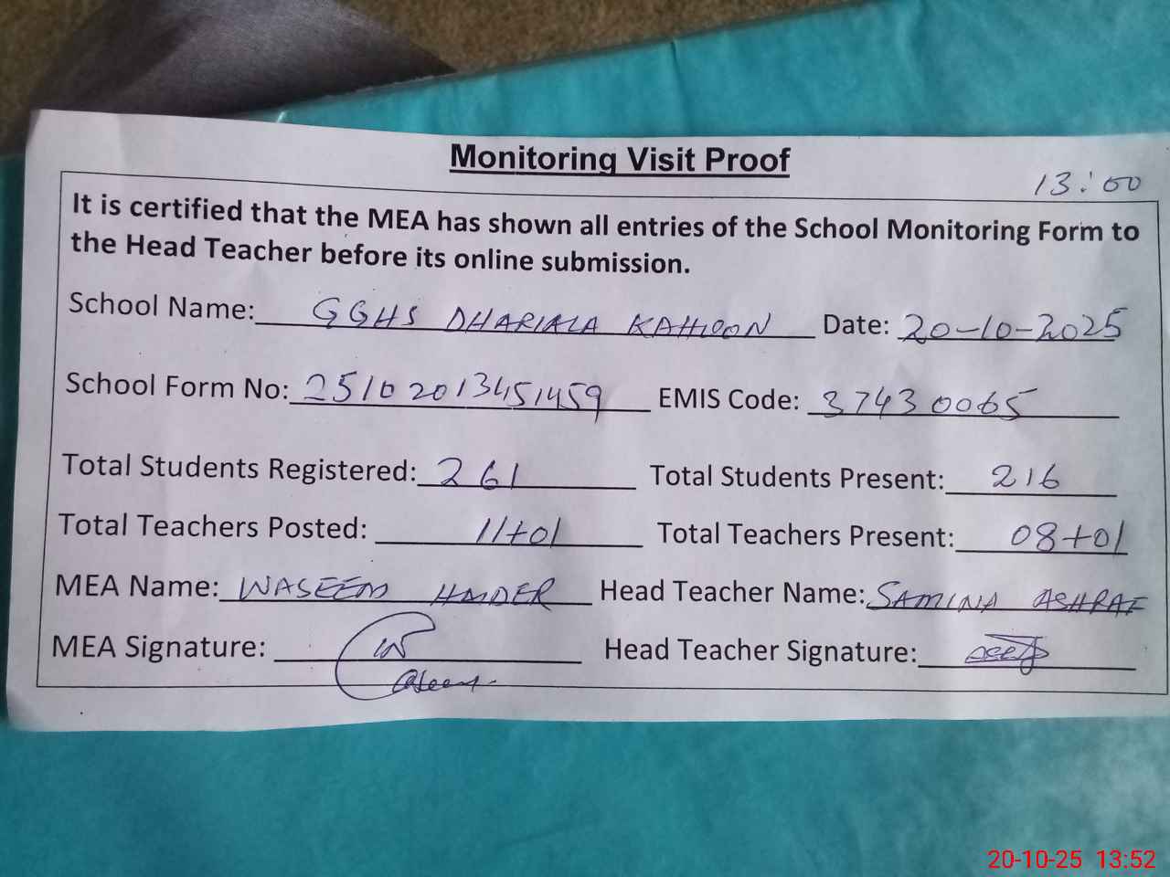 | Attendance Register | Head Teacher | MEA with School | Visit Proof |