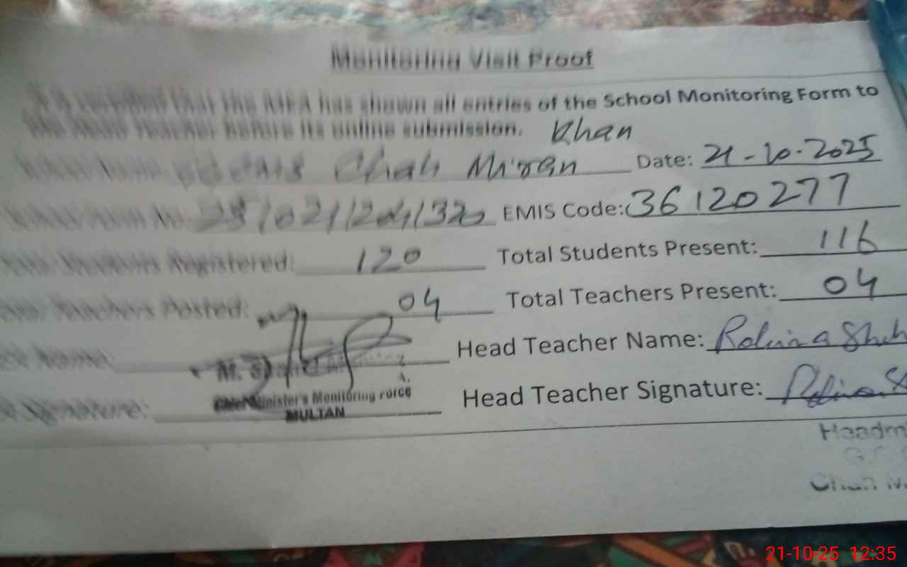 | EMIS Code: 36120277 | Name of School: GGCMS CHAH MIRAN KHAN | |||