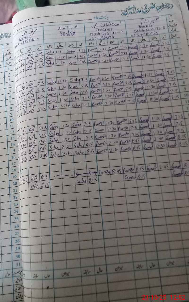 | CNIC | Full Name | Designation | R/C | Absence During Last Calender Month |