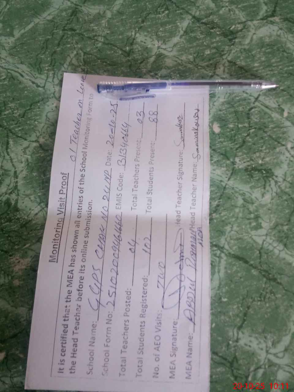 | Attendance Register | Head Teacher | MEA with School | Visit Proof |