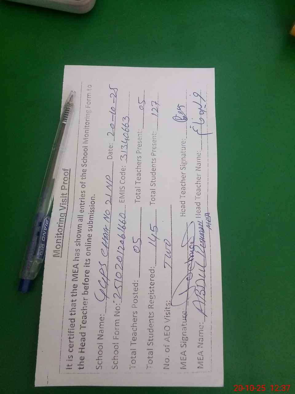 | Attendance Register | Head Teacher | MEA with School | Visit Proof |