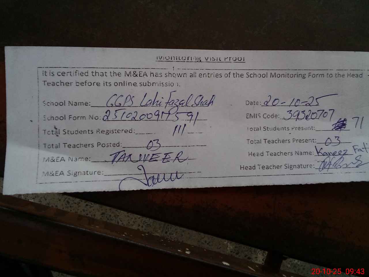 | EMIS Code: 39320707 | Name of School: GGPS LAHI FAZAL SHAH | |||