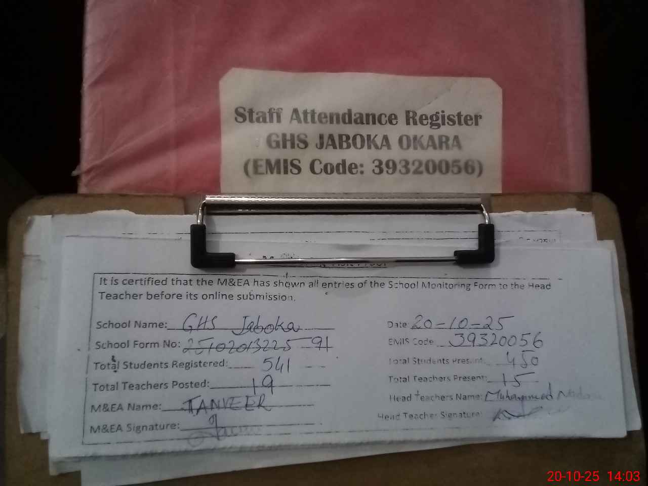 | Attendance Register | Head Teacher | MEA with School | Visit Proof |