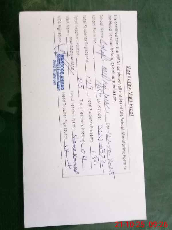 | Certified that this School was Inspected by the Undersigned MEA/DMO Today and the Information Stated Above is as Per Record. | |||||