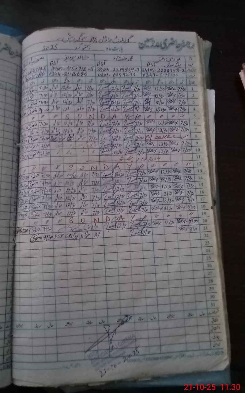 | CNIC | Full Name | Designation | R/C | Absence During Last Calender Month |