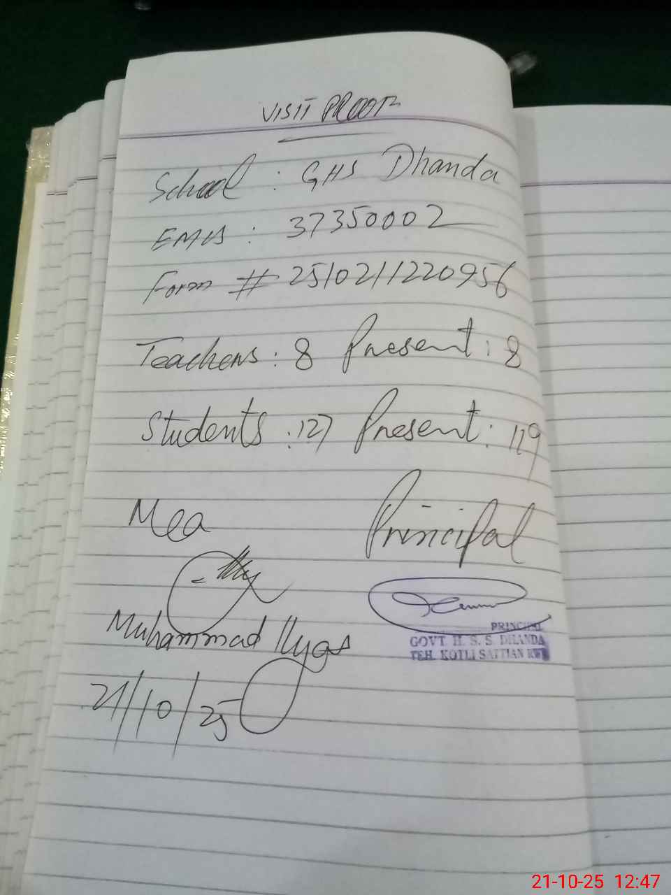 | Attendance Register | Head Teacher | MEA with School | Visit Proof |