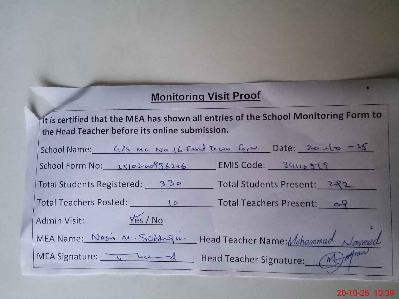 | Certified that this School was Inspected by the Undersigned MEA/DMO Today and the Information Stated Above is as Per Record. | |||||