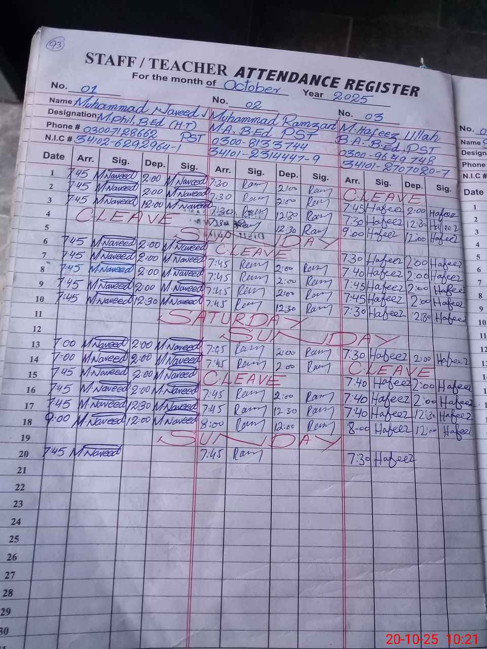 | CNIC | Full Name | Designation | R/C | Absence during last cal. month |