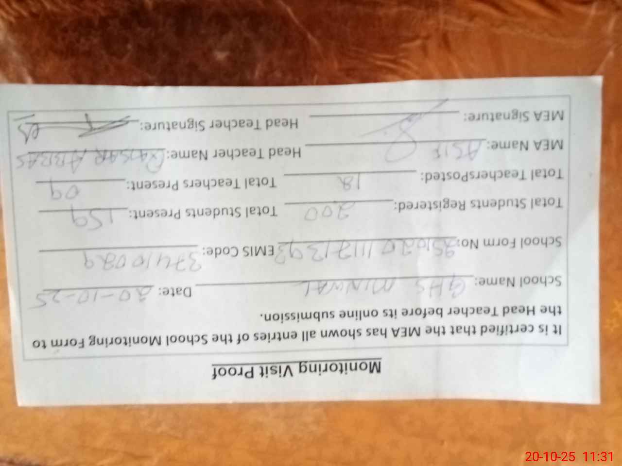 | Attendance Register | Head Teacher | MEA with School | Visit Proof |