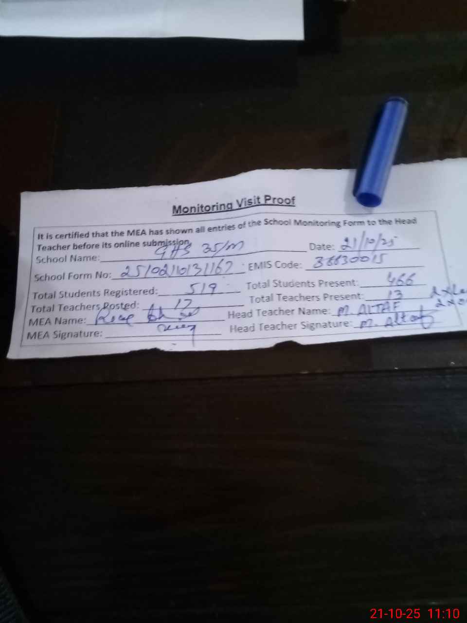 | Attendance Register | Head Teacher | MEA with School | Visit Proof |