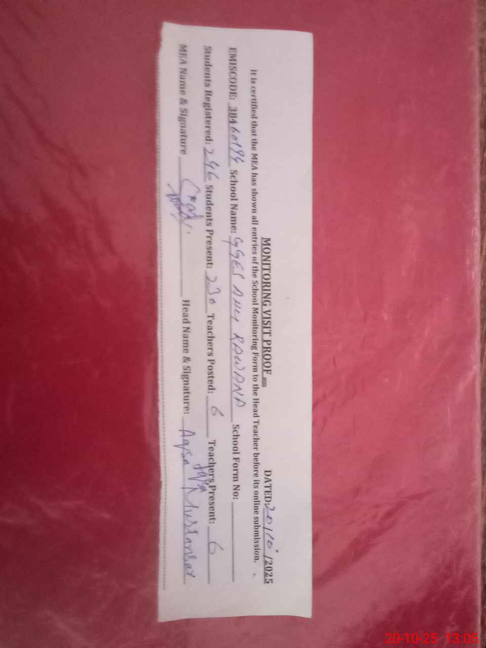 | Certified that this School was Inspected by the Undersigned MEA/DMO Today and the Information Stated Above is as Per Record. | |||||