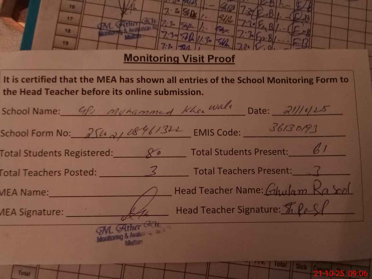 | Attendance Register | Head Teacher | MEA with School | Visit Proof |
