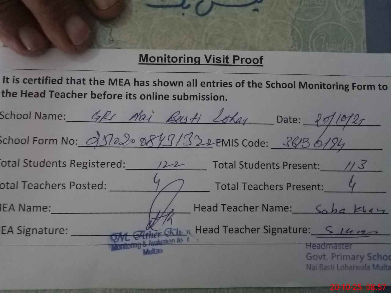 | Attendance Register | Head Teacher | MEA with School | Visit Proof |