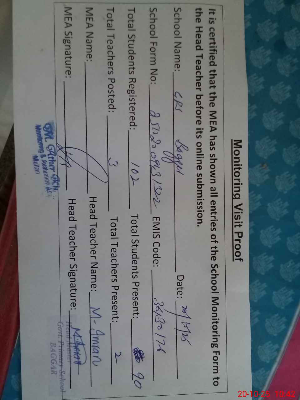 | EMIS Code: 36130176 | Name of School: GPS BAGGER MOZA BAGGAR P/O JAL WALA | |||
