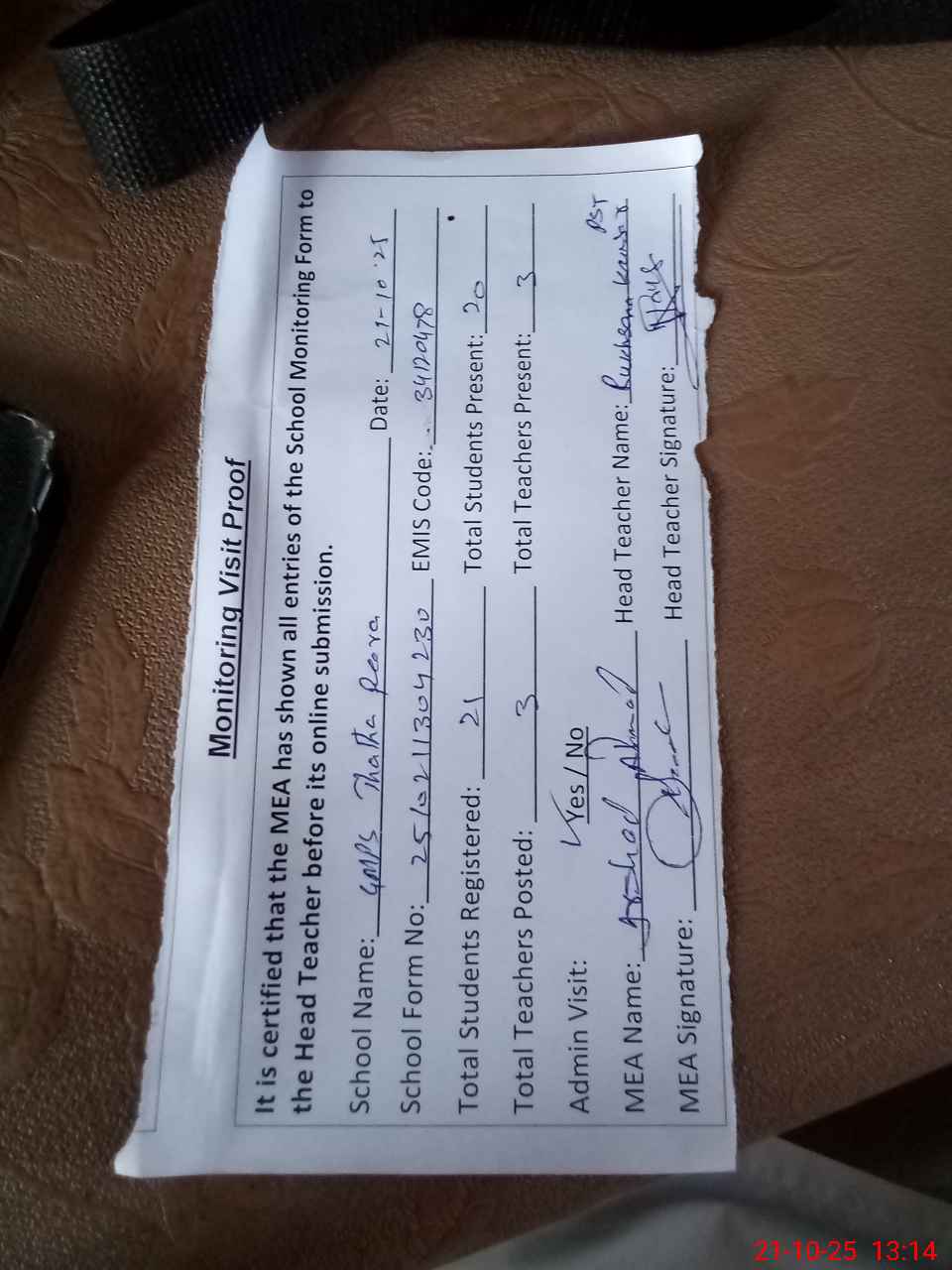 | Attendance Register | Head Teacher | MEA with School | Visit Proof |