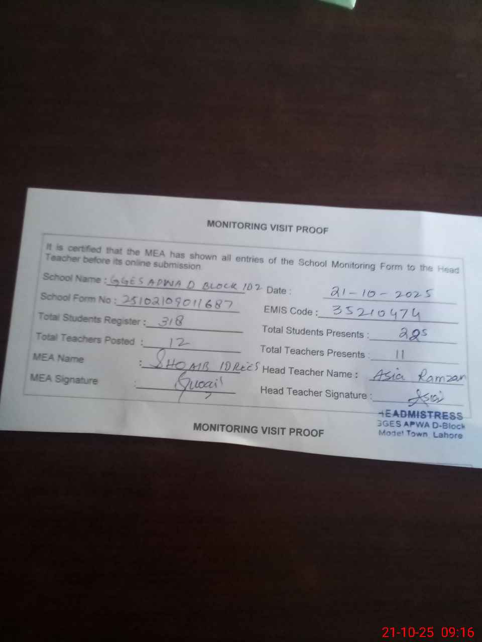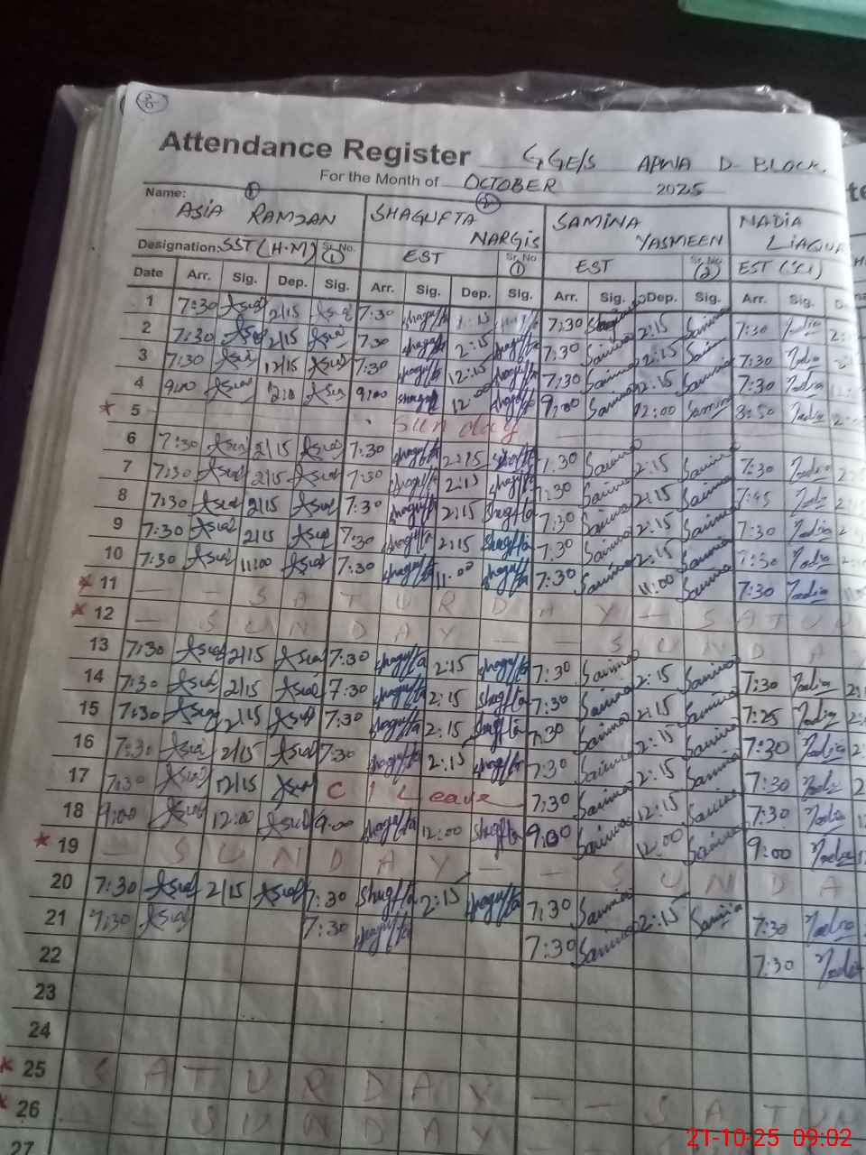 | Remarks (Use Separate Page if Required): 1 The following teachers have been resigned from service but their name still visible in drop down teacher list Irum Bashir PST 01 Dec 2023 Aysha Afzal PST 05 Jan 2023 2 Sadia Arshad PST has been absent since 01 Sep 2025 | |||||
