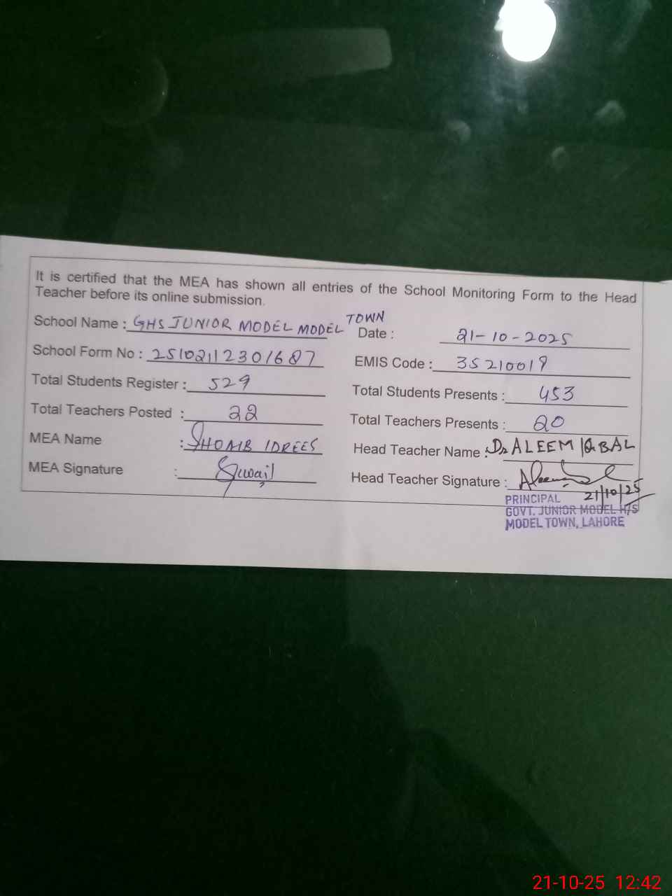 | EMIS Code: 35210019 | Name of School: GHS JUNIOR MODEL MODEL TOWN LAHORE | |||