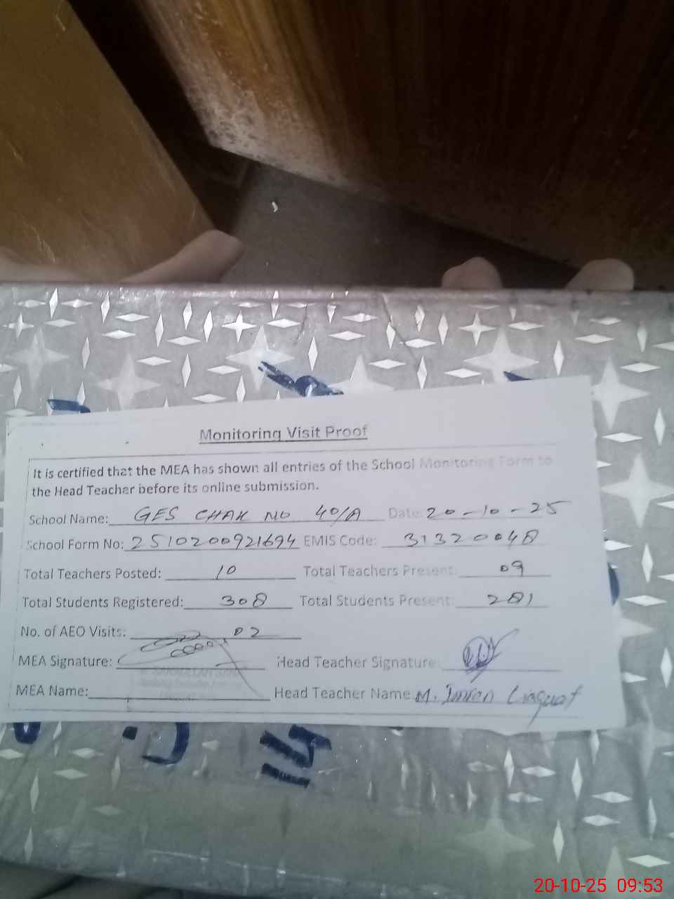 | Attendance Register | Head Teacher | MEA with School | Visit Proof |