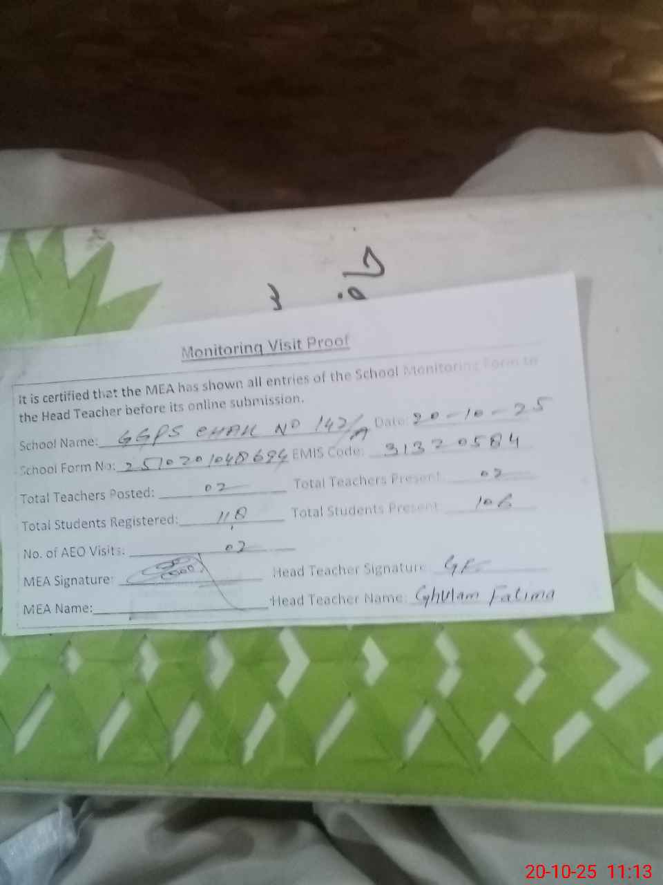 | Attendance Register | Head Teacher | MEA with School | Visit Proof |