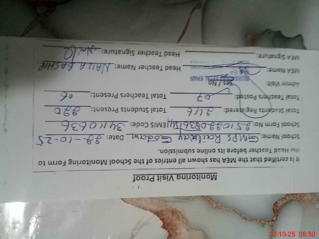 | Certified that this School was Inspected by the Undersigned MEA/DMO Today and the Information Stated Above is as Per Record. | |||||