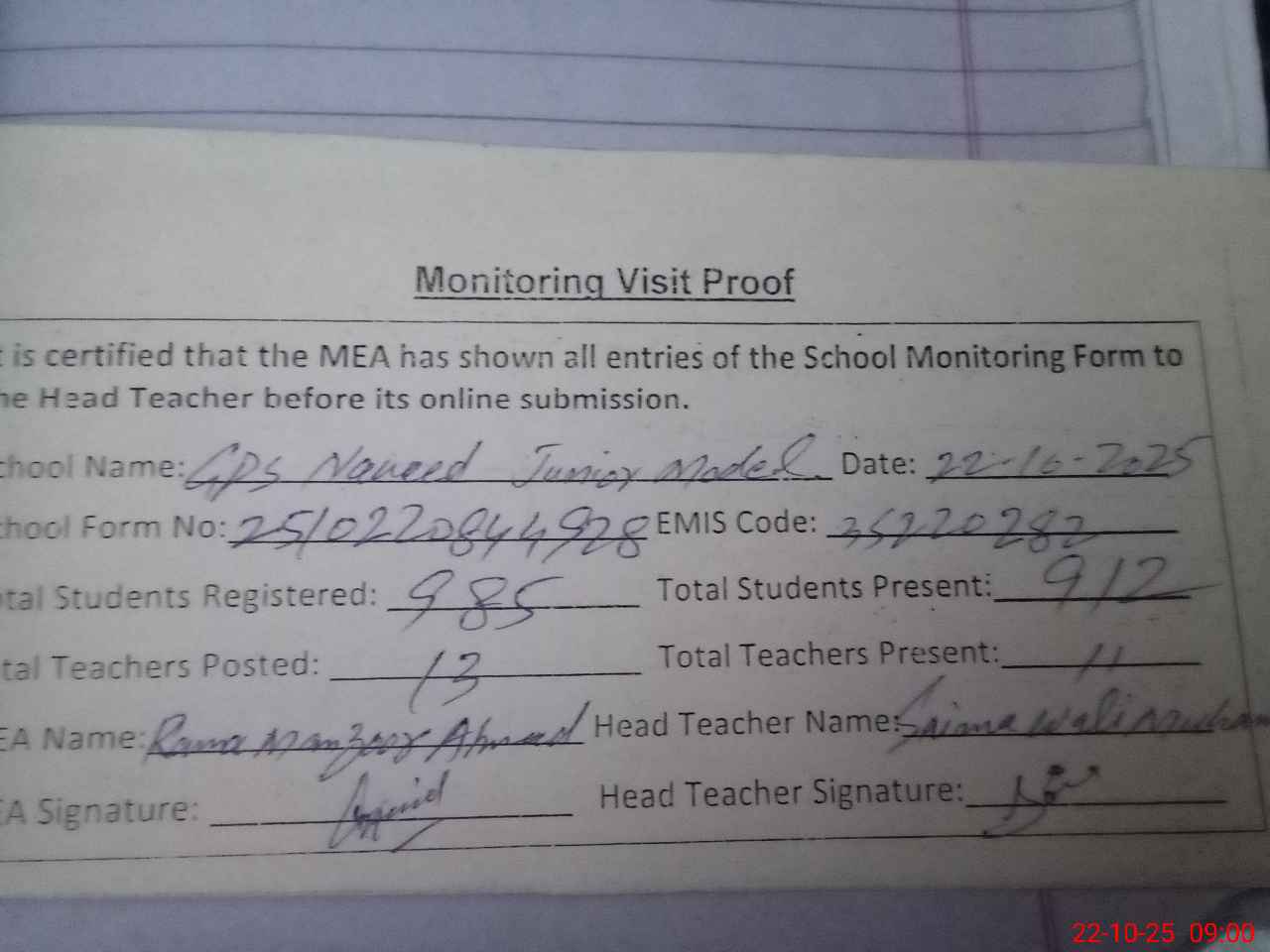 | Monitoring Date: 22-10-2025 | Start Time: 22-10-2025 08:15 AM | End Time: 22-10-2025 09:03 AM | Name of MEA: Ra**** Ma**** Ah**** | |