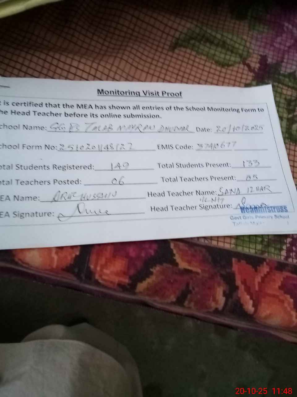 | Attendance Register | Head Teacher | MEA with School | Visit Proof |
