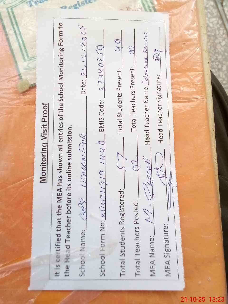 | Attendance Register | Head Teacher | MEA with School | Visit Proof |