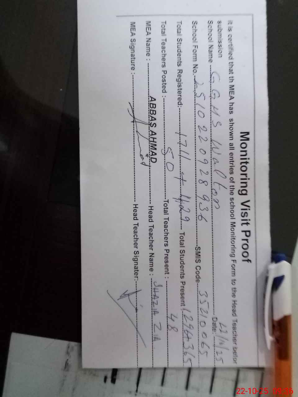 | Attendance Register | Head Teacher | MEA with School | Visit Proof |